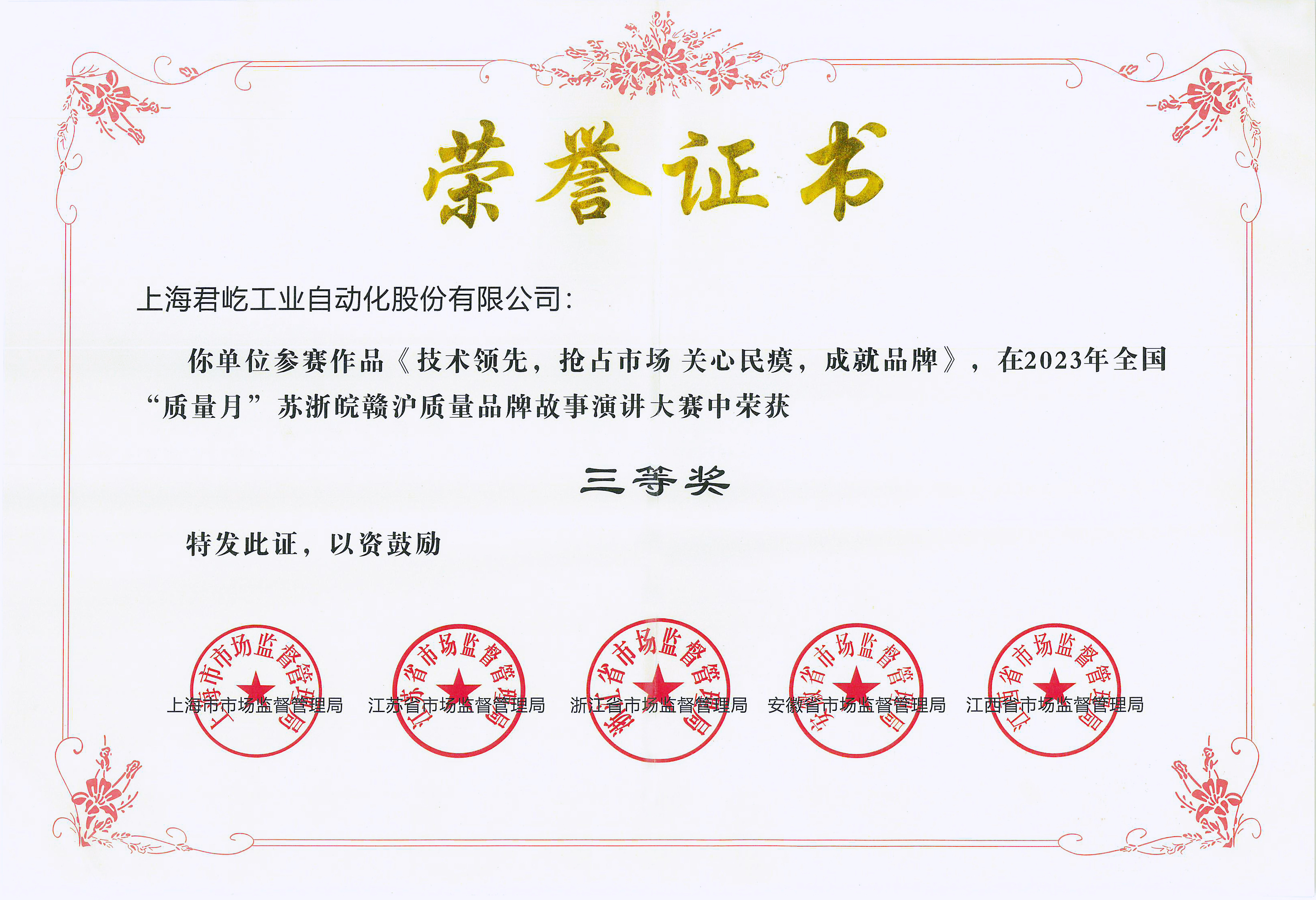 The 2023 National "Quality Month" Joint Launching Ceremony for Jiangsu, Zhejiang, Anhui, Jiangxi, and Shanghai was grandly held in Shanghai in September. Among numerous brands from the four provinces and one municipality, Shanghai Junyi Industrial Automation Co., Ltd.'s story—"Leading Technology, Seizing Market Opportunities; Caring for People's Needs, Building a Strong Brand"—stood out and earned third prize in the 2023 Jiangsu-Zhejiang-Anhui-Jiangxi-Shanghai Quality Brand Story Competition.