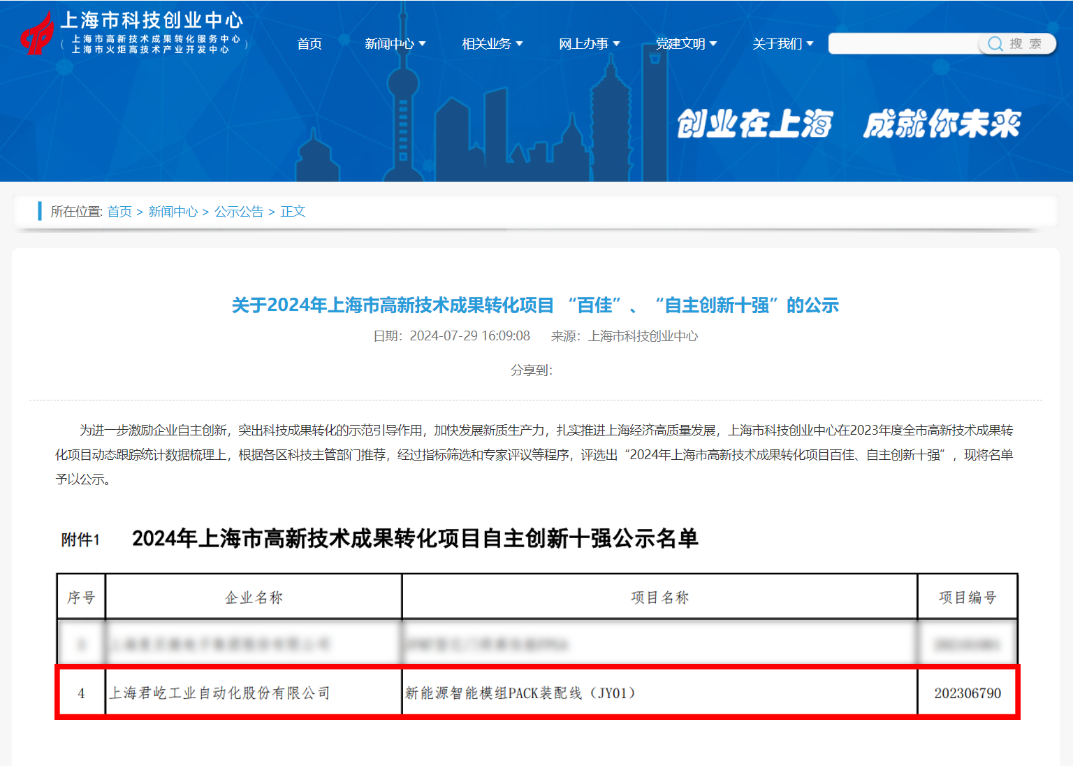Recently, the evaluation process for Shanghai's 2024 "Top 100" and "Top 10 Independent Innovation" high-tech achievement transformation projects—led by the Shanghai Science and Technology Entrepreneurship Center—concluded. Among the winners, Shanghai Junyi's fully independently developed and innovative "New Energy Intelligent Module PACK Assembly Line (JY01)" project successfully passed review by both the relevant authorities and an expert panel, earning the prestigious title of "Top 10 Independent Innovation Projects" in Shanghai's 2024 high-tech achievement transformation initiative.