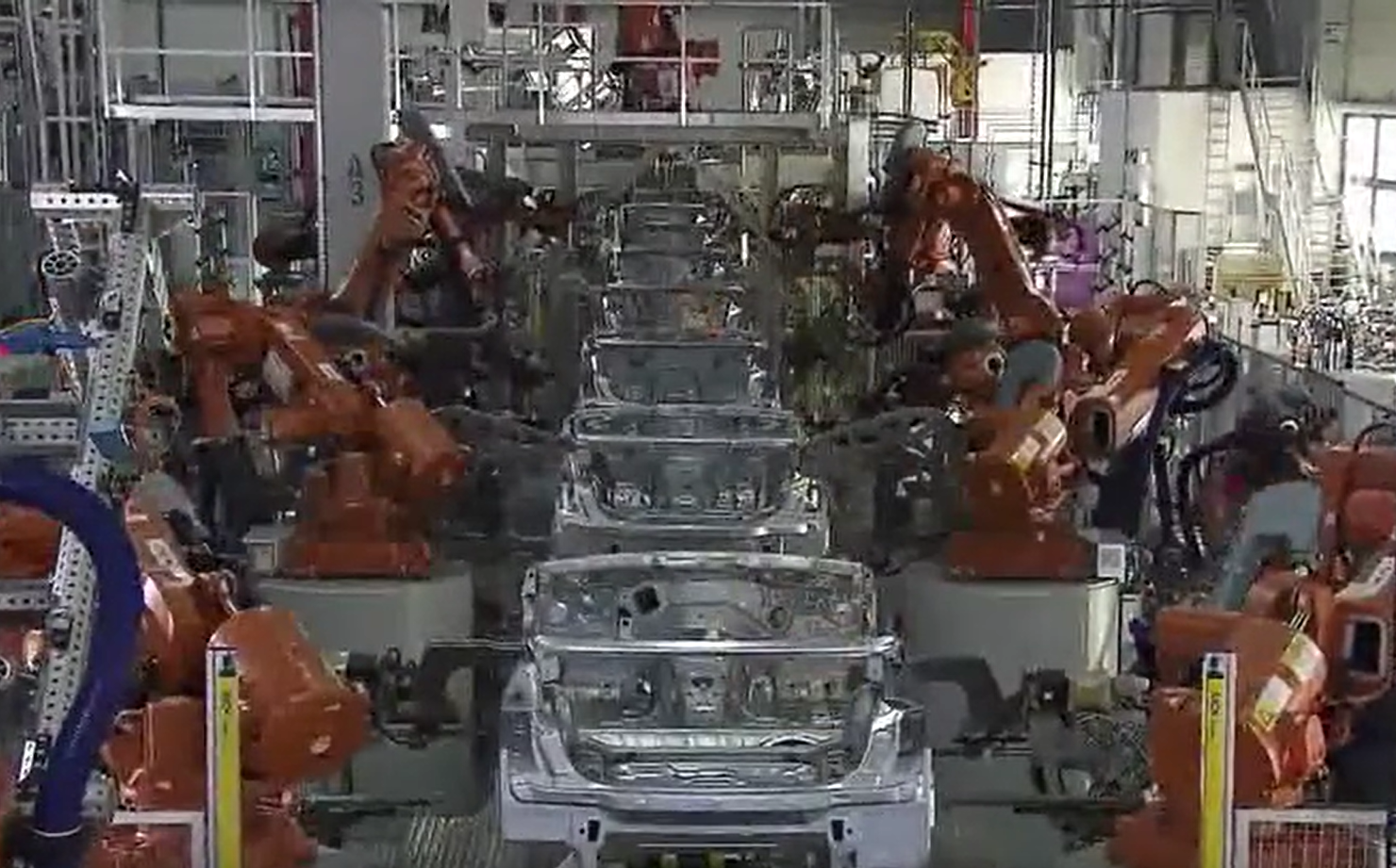 The sight of the main welding line is truly spectacular—first, the front and rear floor panels are joined to form the complete floor assembly, followed by the left and right side panels, and then the roof panel.