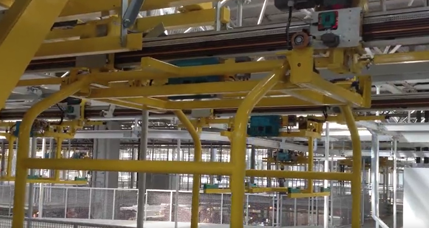 After the vehicle body components enter the welding assembly workshop and are processed individually along their respective lines, they are all transported to the main welding line for final assembly. Typically, transportation is handled by EMS conveyor carts located on the second floor of the workshop. Once processing is complete at each sub-line, the components are lifted via elevators to the second-floor carts, which then carry them directly to the main welding line.