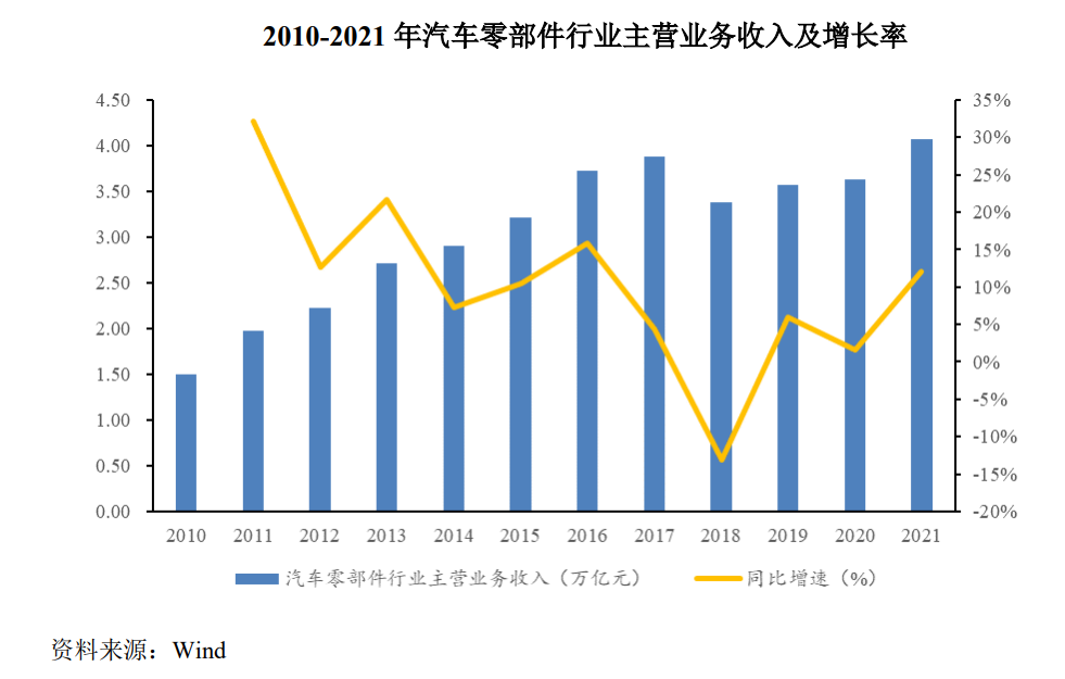 China's downstream vehicle industry has experienced rapid growth, driving the steady expansion of its automotive components sector. According to Wind data, from 2010 to 2017, China's component industry saw continuous growth in main business revenue, rising from 1.50 trillion yuan to 3.88 trillion yuan, with a compound annual growth rate of 14.58%.