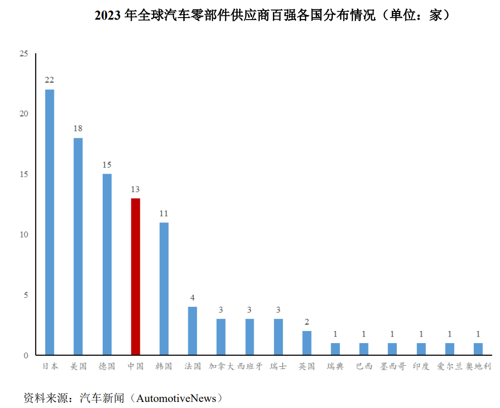 According to the 2023 Global Top 100 Automotive Parts Suppliers ranking published by U.S. publication Automotive News, Japan, U.S., Germany The traditional dominance of major automotive parts countries remains stable, with Japan and the U.S. ranking first and second, respectively, boasting 22 and 18 companies. Germany ranks third globally with 15 enterprises. China’s auto parts industry started relatively late, but after persistent efforts to catch up, it has achieved remarkable progress, securing fourth place worldwide with 13 companies.